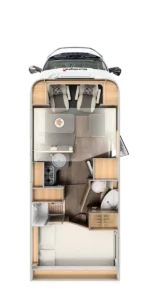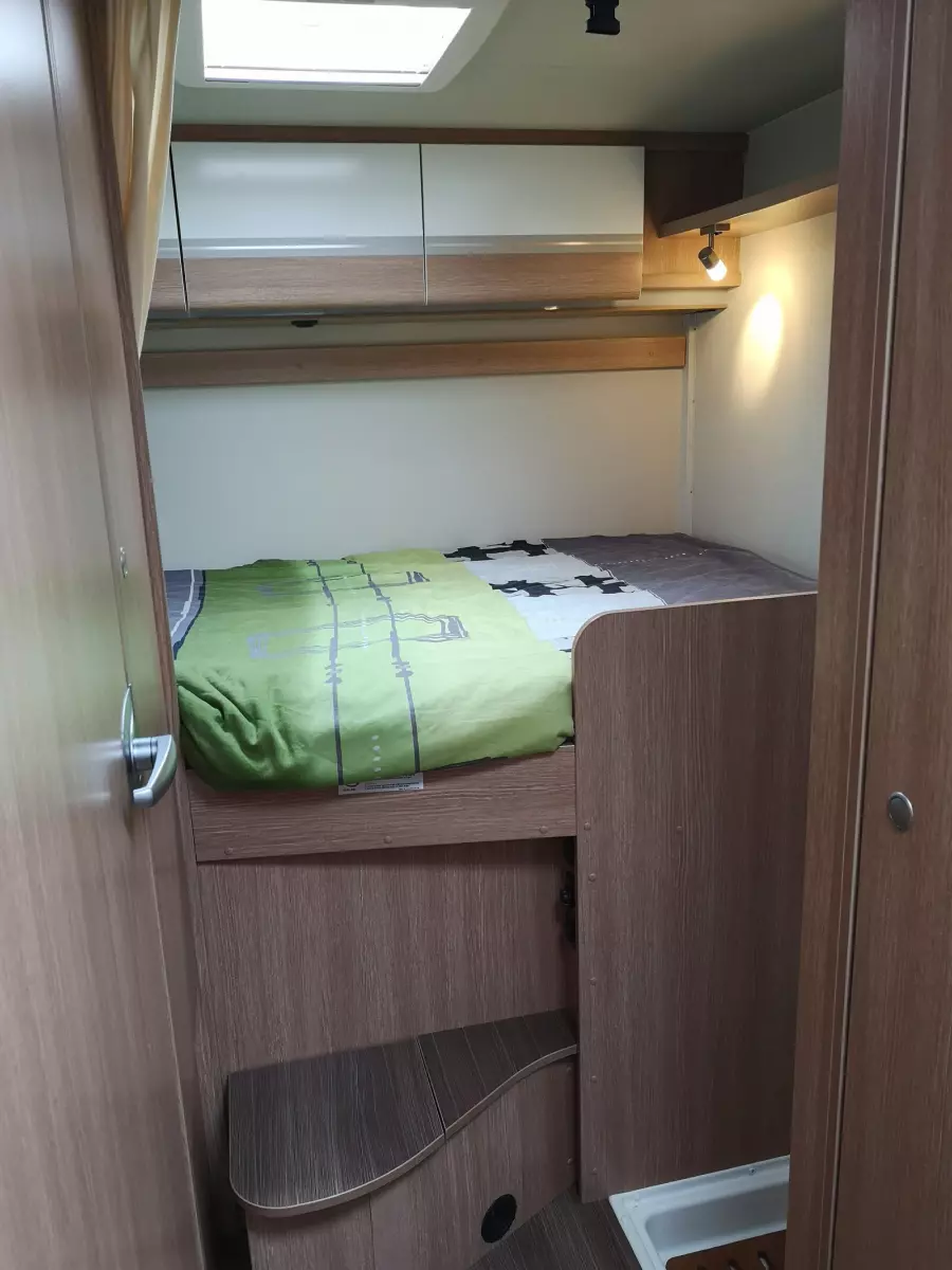 Idéal pour 2 à 4 personnes, 7m de long, lit transversal à l’arrière, lit rabattable, douche/WC séparés, auvent, grand garage, porte-vélos 4 voies.